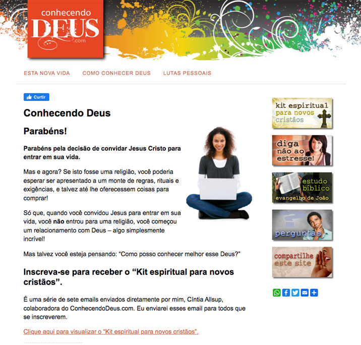 Ao entrar no ConhecendoDeus.com, você verá imediatamente um convite para se inscrever num estudo gratuito chamado: “Kit Espiritual para Novos Cristãos”. Este Kit é um bom lugar para começar e foi feito especialmente para você, embora todo os recursos disponíveis no site tenham todos sido feitos para você.